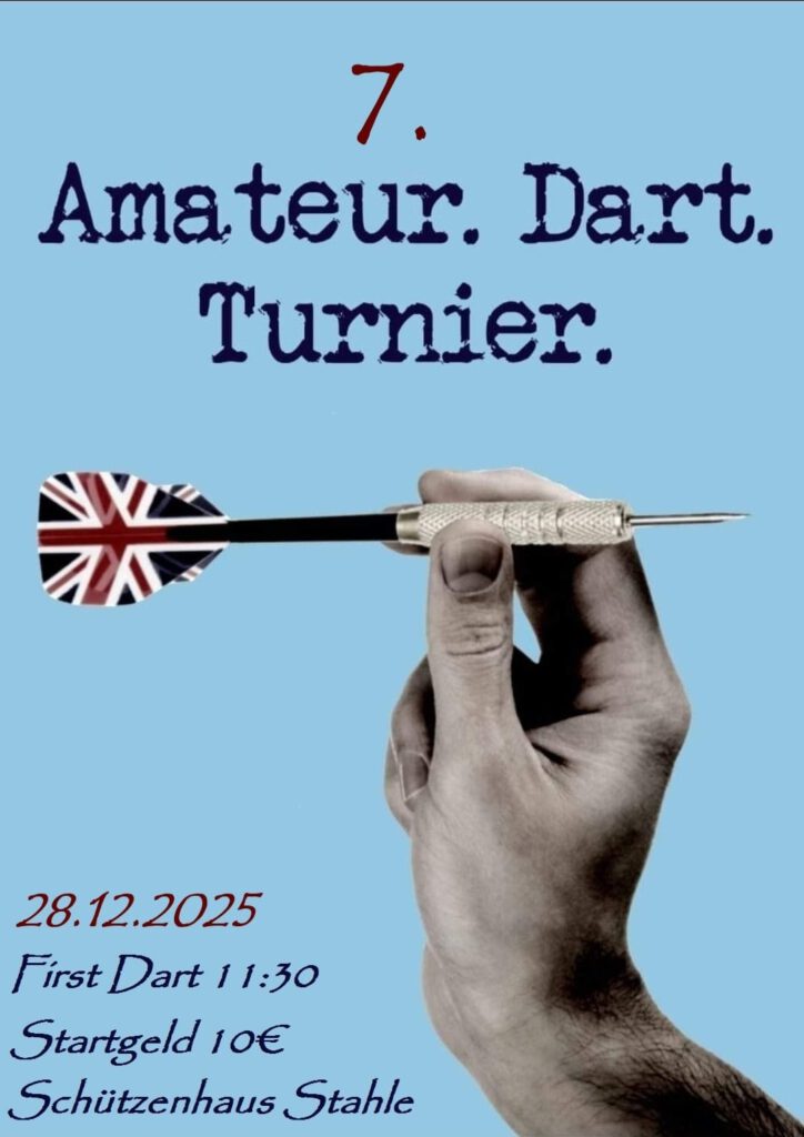 Am 28.12.2025 um 11:30 Uhr startet unser Dart Turnier bereits schon zum 7ten mal. Anmeldung liegt im Schützenhaus aus oder beim Vorstand. Das Startgeld beträgt 10€.
