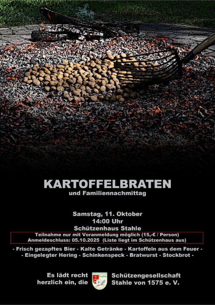 Unser beliebtes Kartoffelbraten ist am Samstag den 11. Oktober 2025 um 14 Uhr. Meldet euch bis zum 05.10.25 an, die Liste liegt im Schützenhaus.